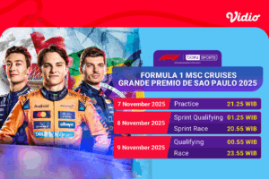 Seluruh siaran Formula 1 GP São Paulo 2025 dapat dinikmati secara langsung di Vidio, platform penayangan resmi F1 di Indonesia. Dengan kualitas tayangan yang stabil serta akses mudah melalui berbagai perangkat, Vidio menawarkan pengalaman menonton lengkap untuk pecinta balap mobil kelas dunia.
